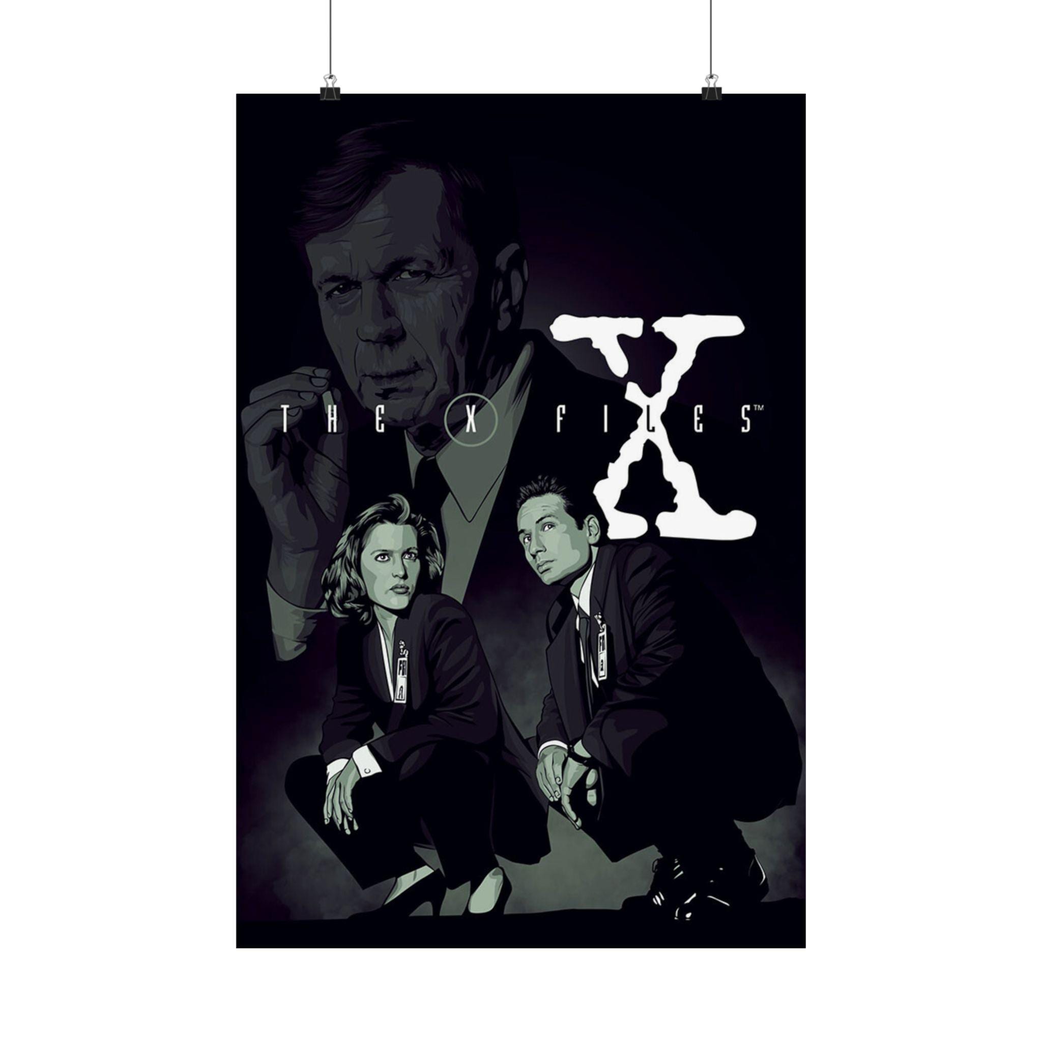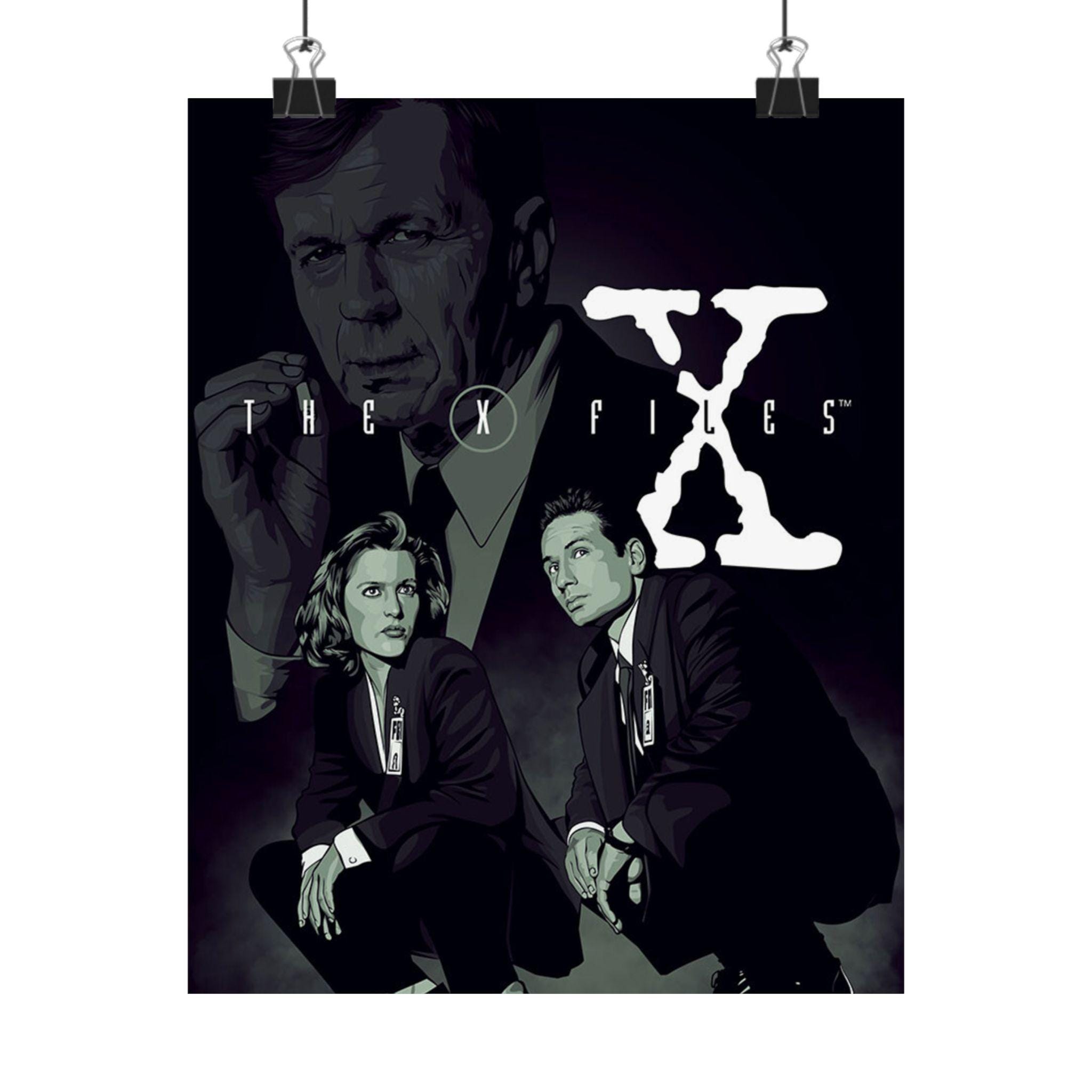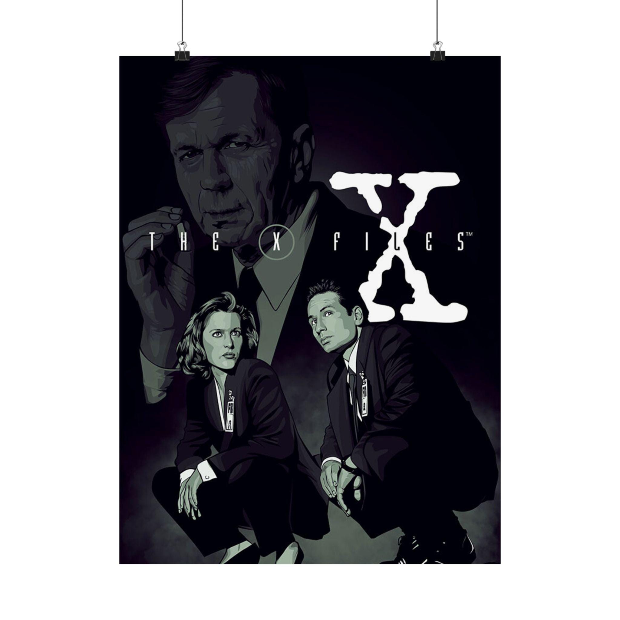 An X Files poster featuring Mulder, Scully, and the cigarette man from the hit TV show. Perfect for fans of the show looking to add a touch of mystery and intrigue to their space. Ideal for those who enjoy sci-fi and paranormal genres. Great for decorating a home theater, office, or fan cave. Relevant for Halloween, Comic-Con, and sci-fi conventions.