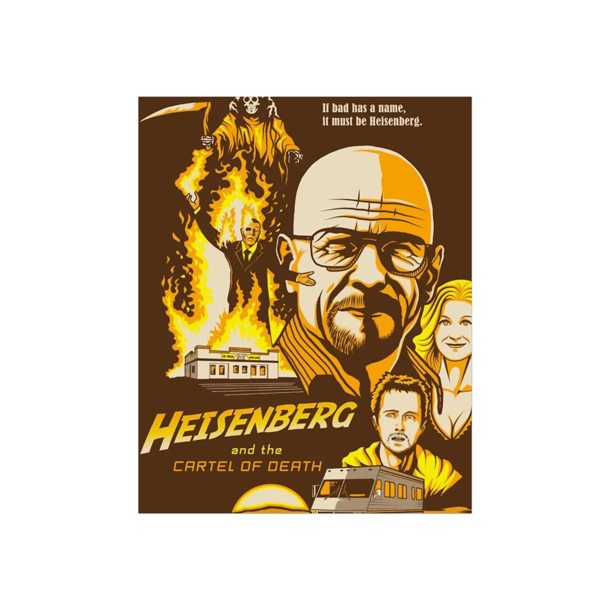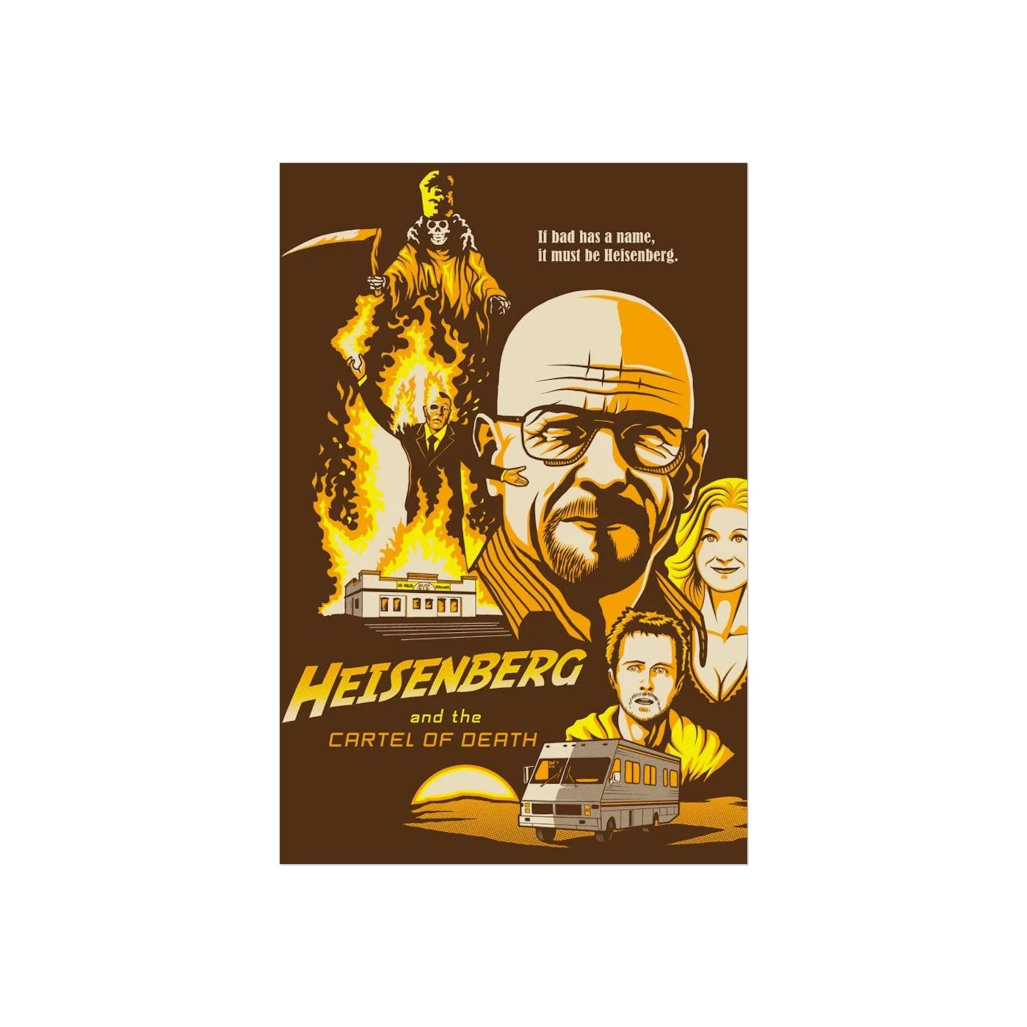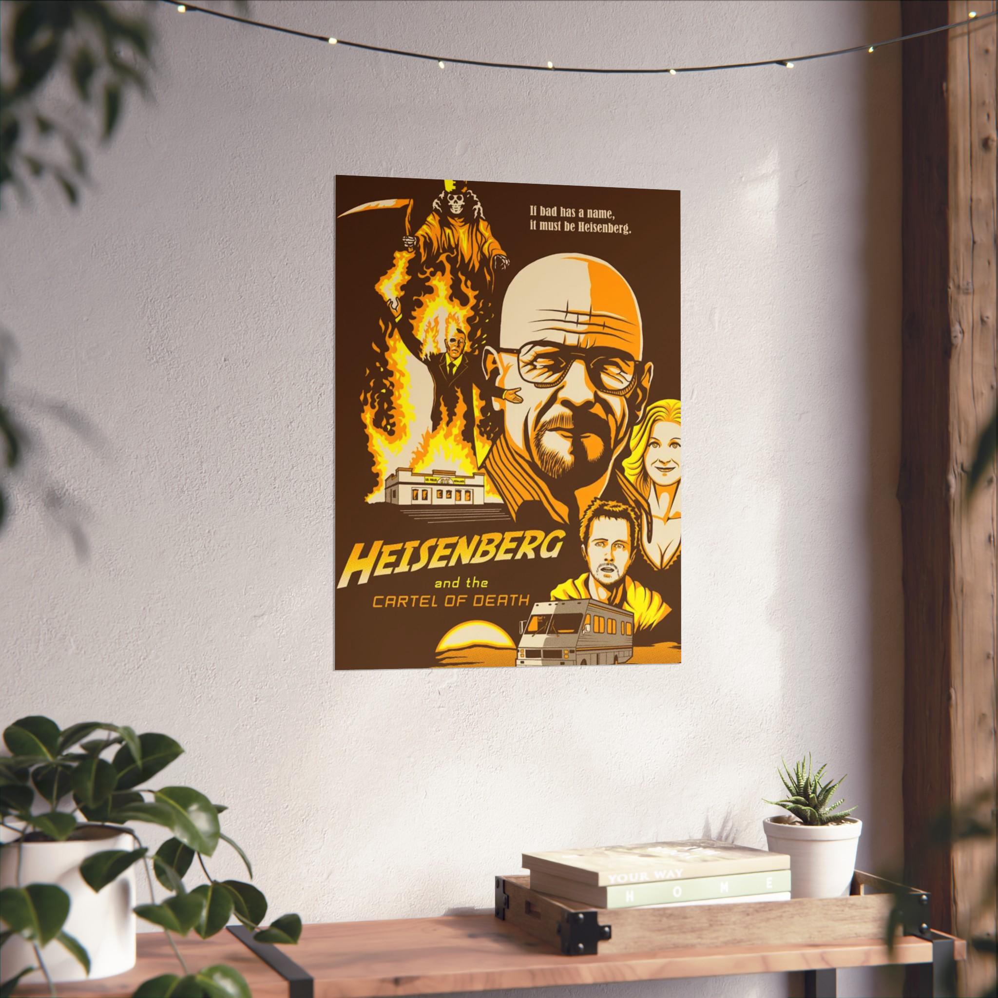 A Breaking Bad Poster featuring Walter White's face and emphasizing his Heisenberg identity. Perfect for fans of the show looking to add a touch of the iconic series to their space. Ideal for TV show enthusiasts, collectors, and those celebrating fandom.