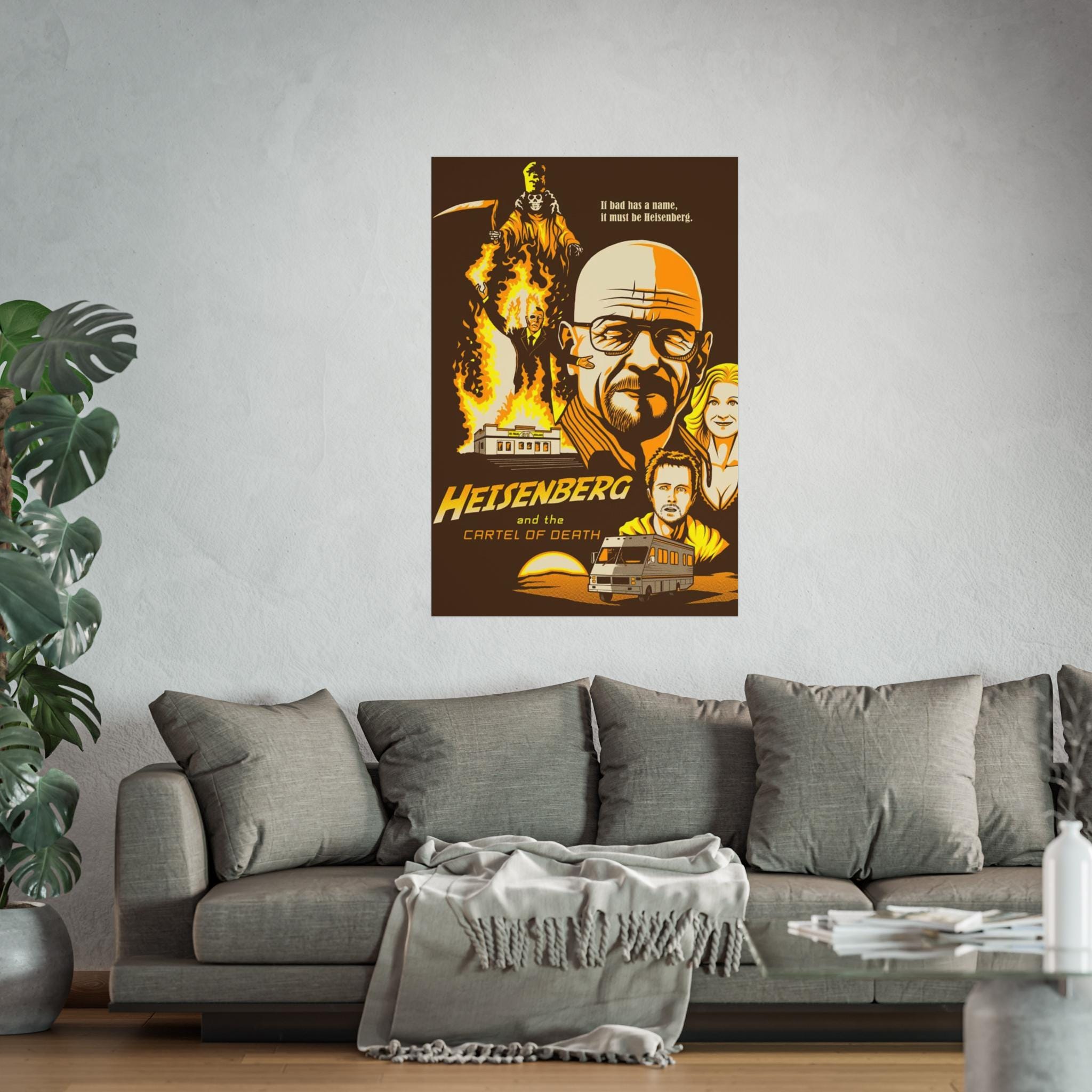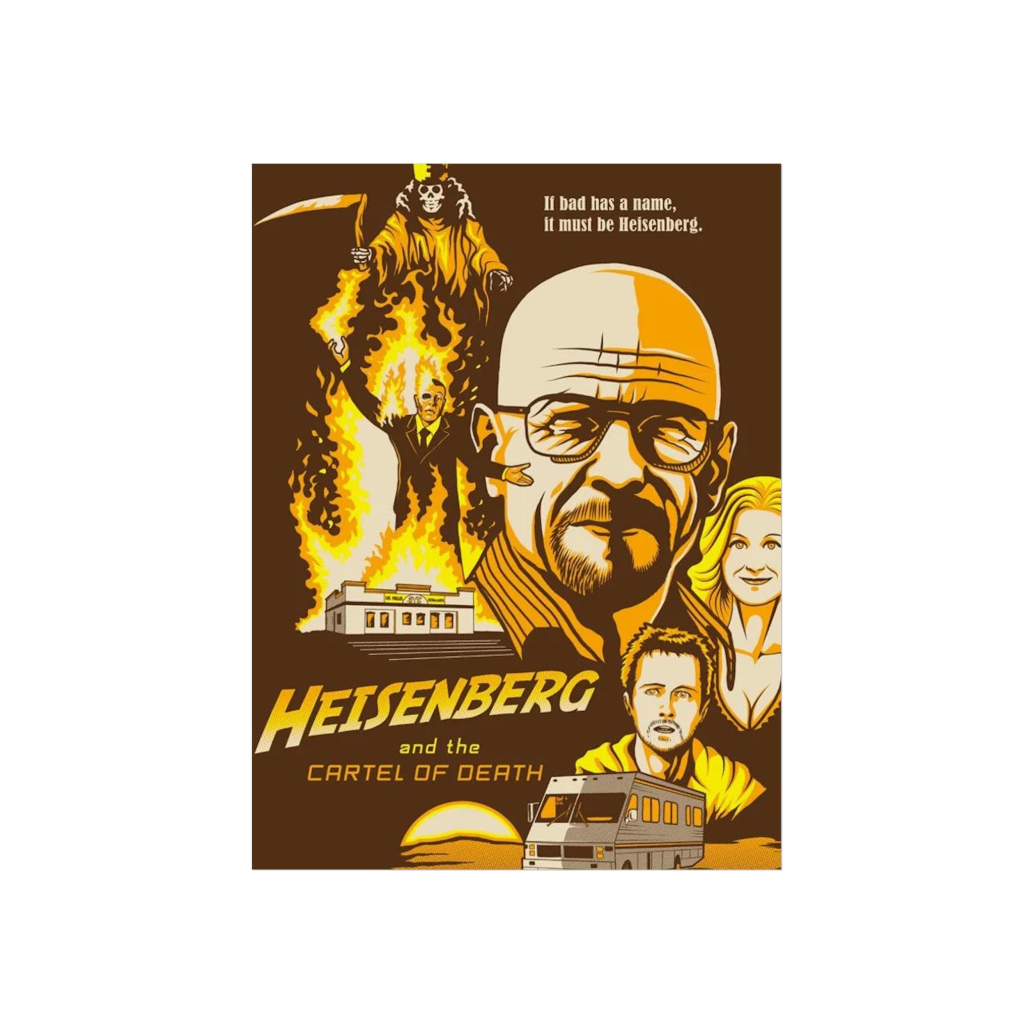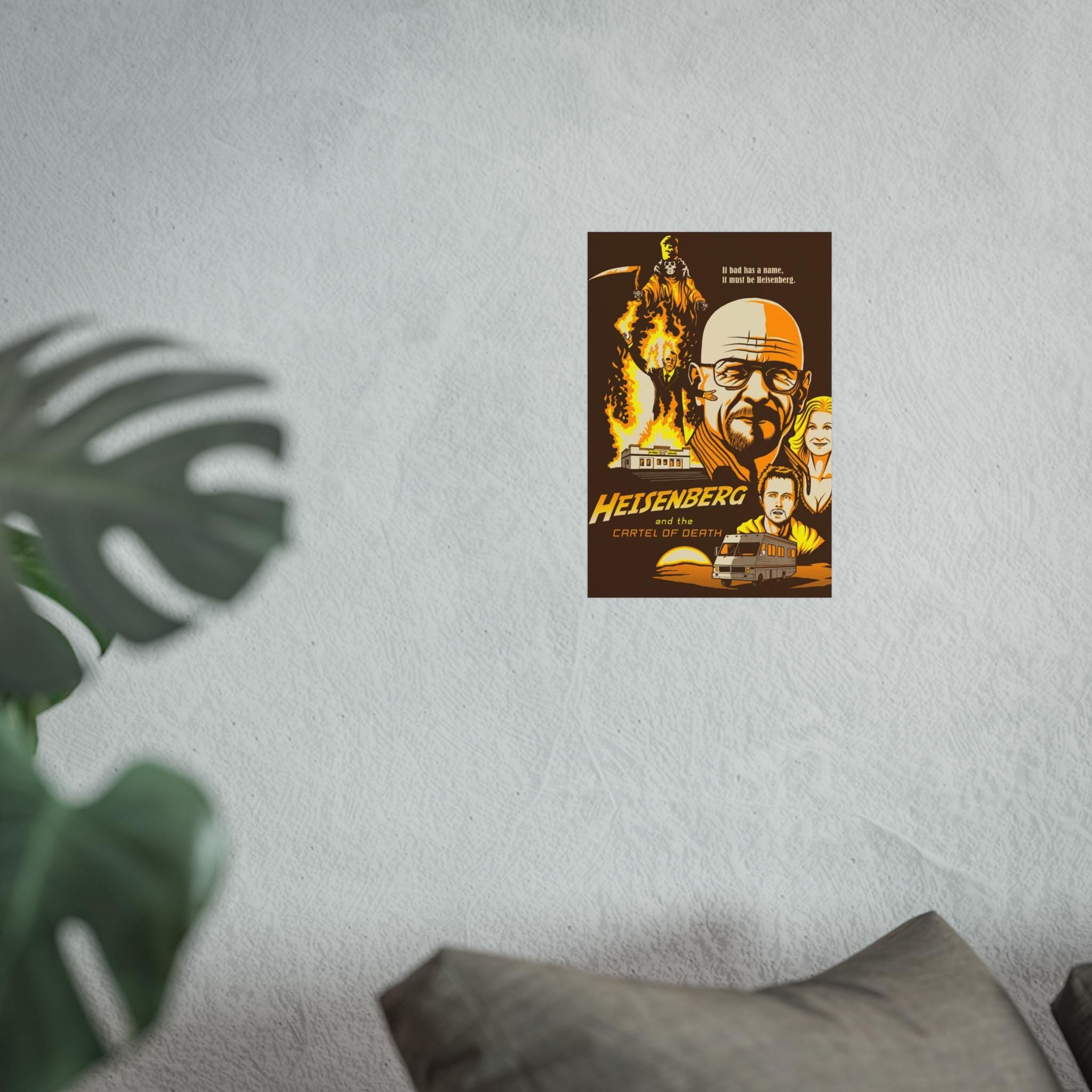 A Breaking Bad Poster featuring Walter White's face and emphasizing his Heisenberg identity. Perfect for fans of the show looking to add a touch of the iconic series to their space. Ideal for TV show enthusiasts, collectors, and those celebrating fandom.