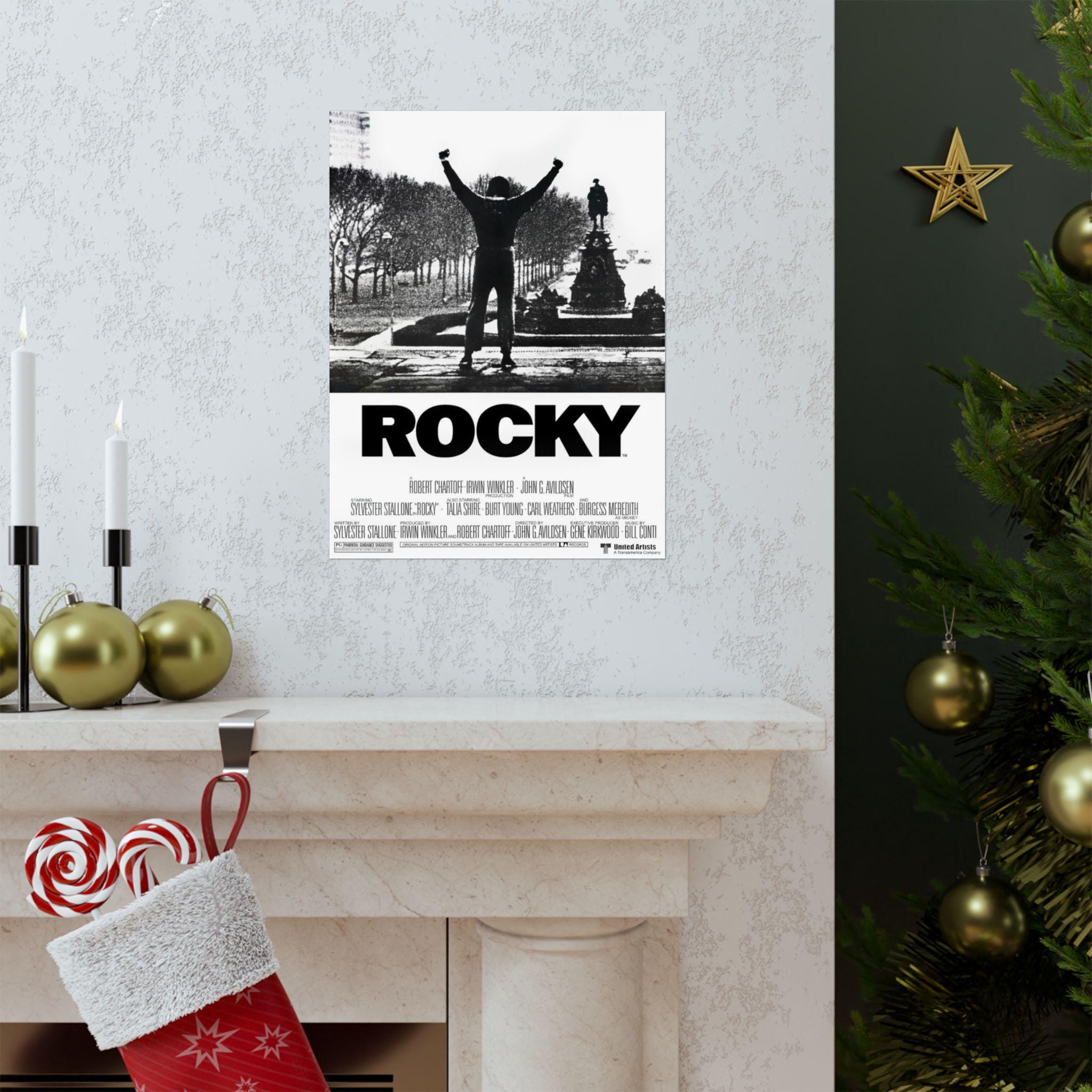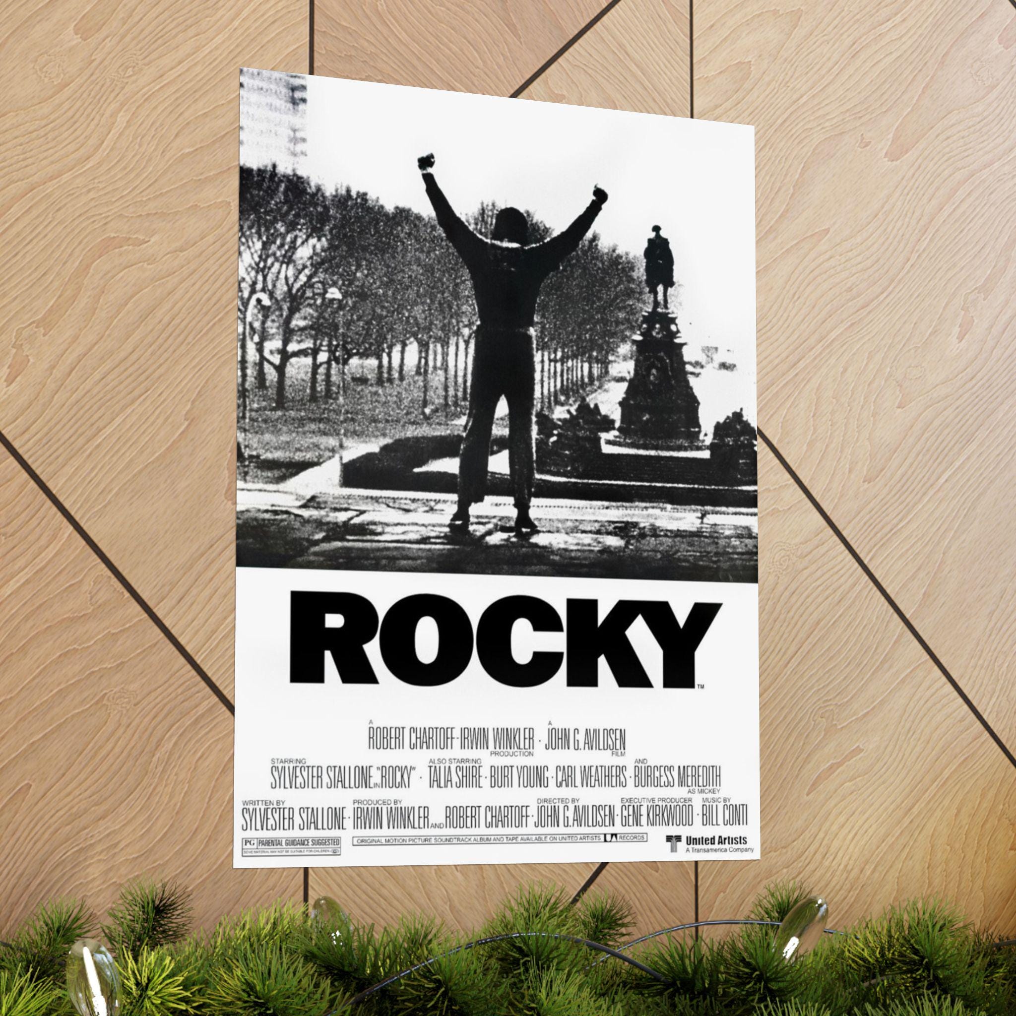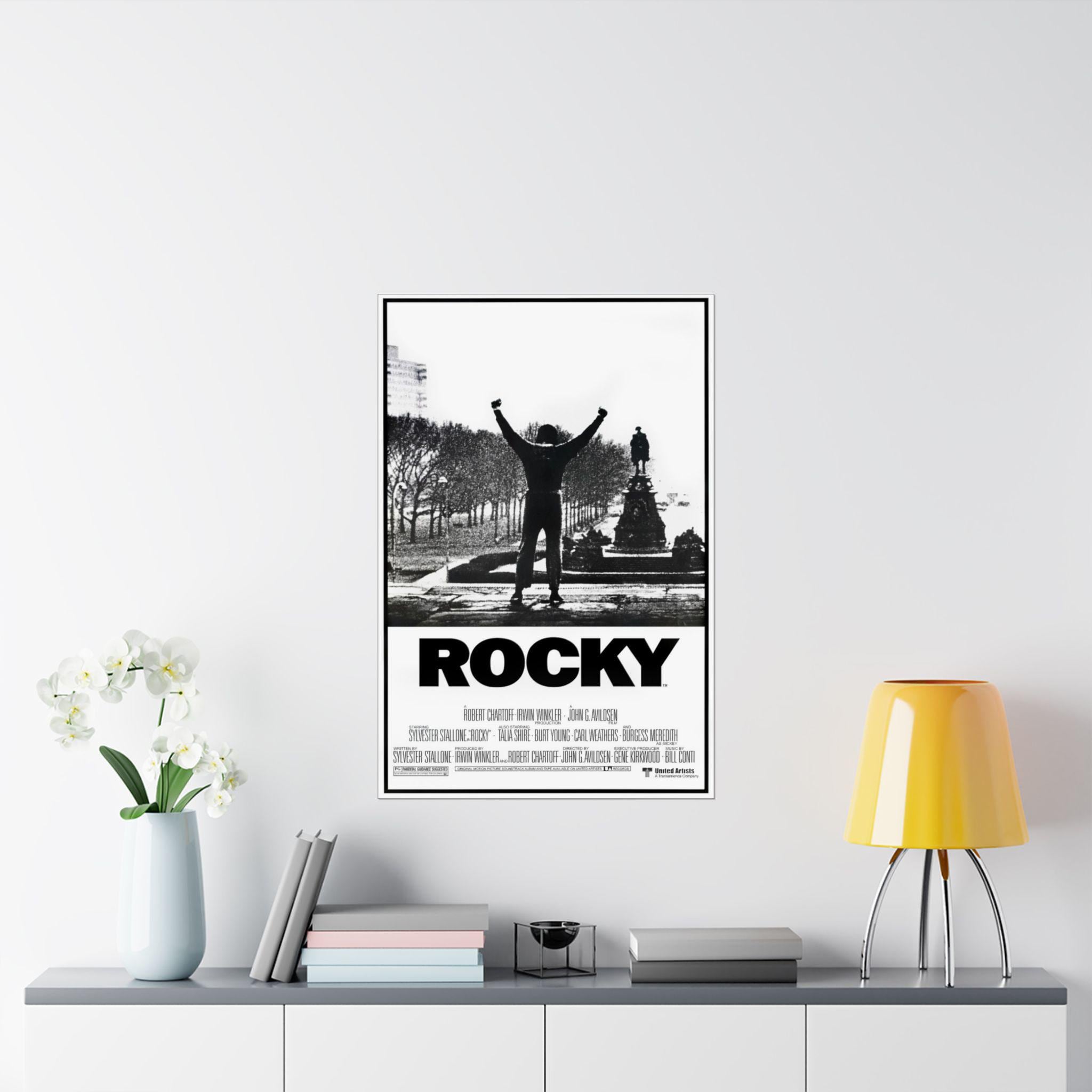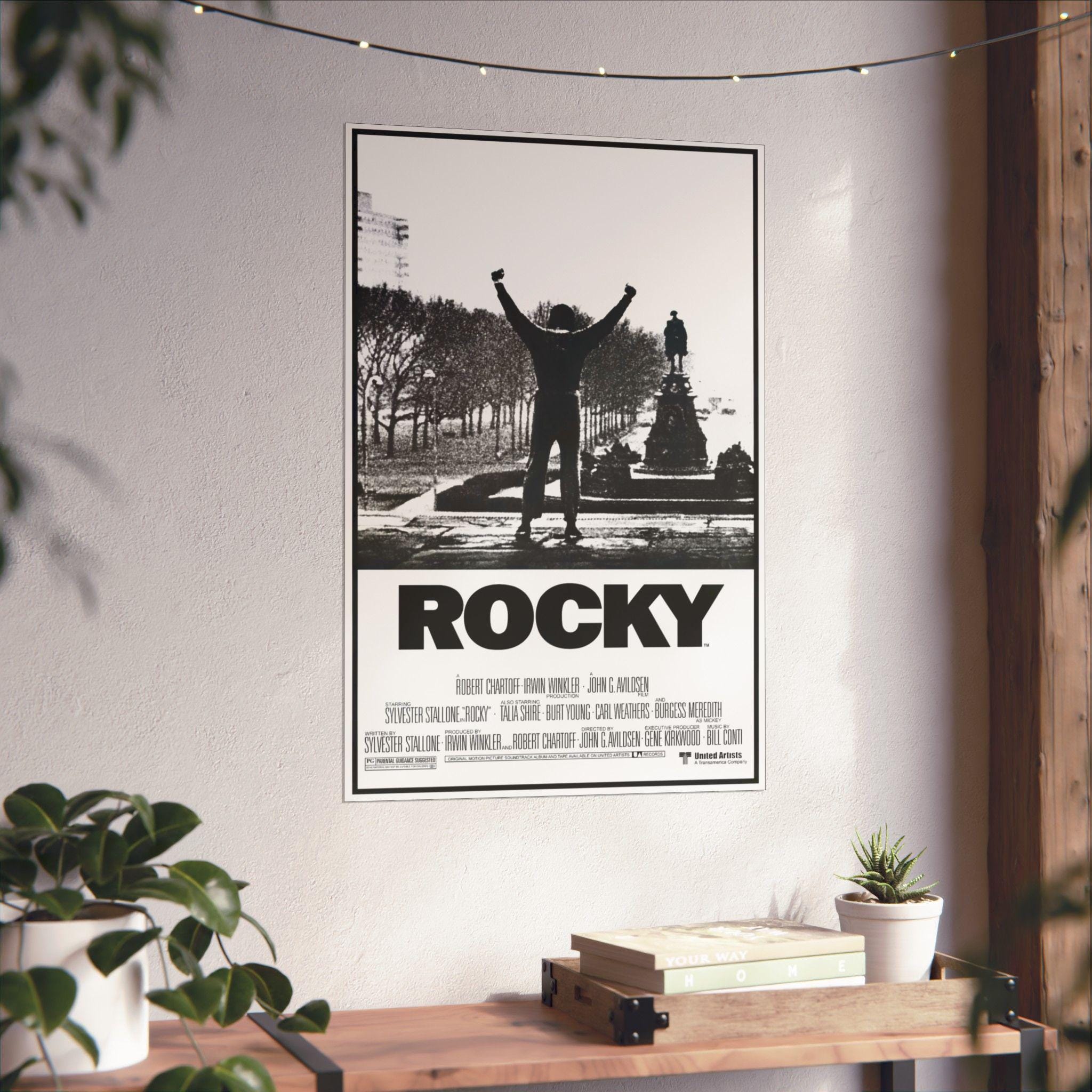 This Rocky movie poster featuring Sylvester Stallone as the star Rocky Balboa brings a classic movie vibe to any room. Perfect for movie enthusiasts and fans of the Rocky franchise, this matte vertical poster is ideal for decorating a home theater or entertainment space. Great for commemorating movie nights, birthdays, or simply adding a touch of retro charm to any decor.
