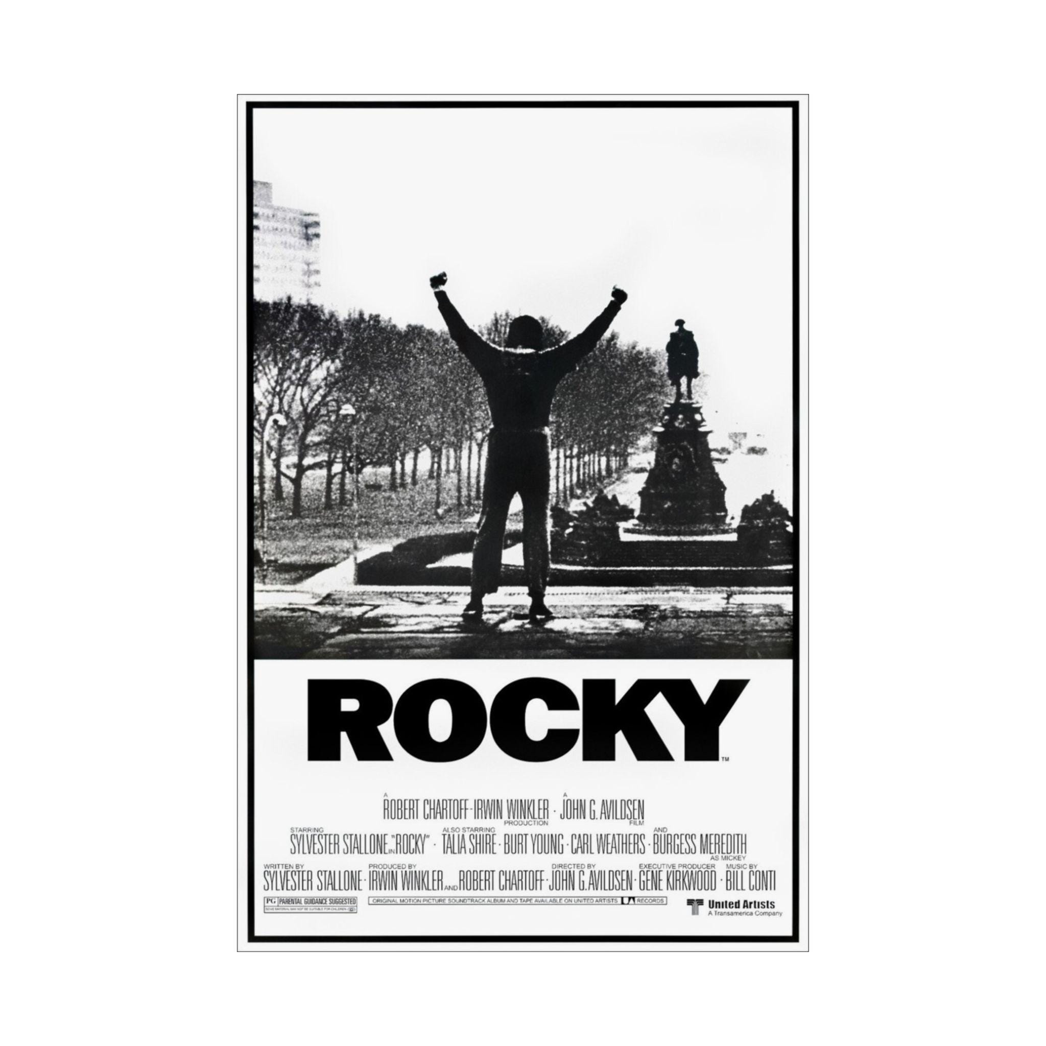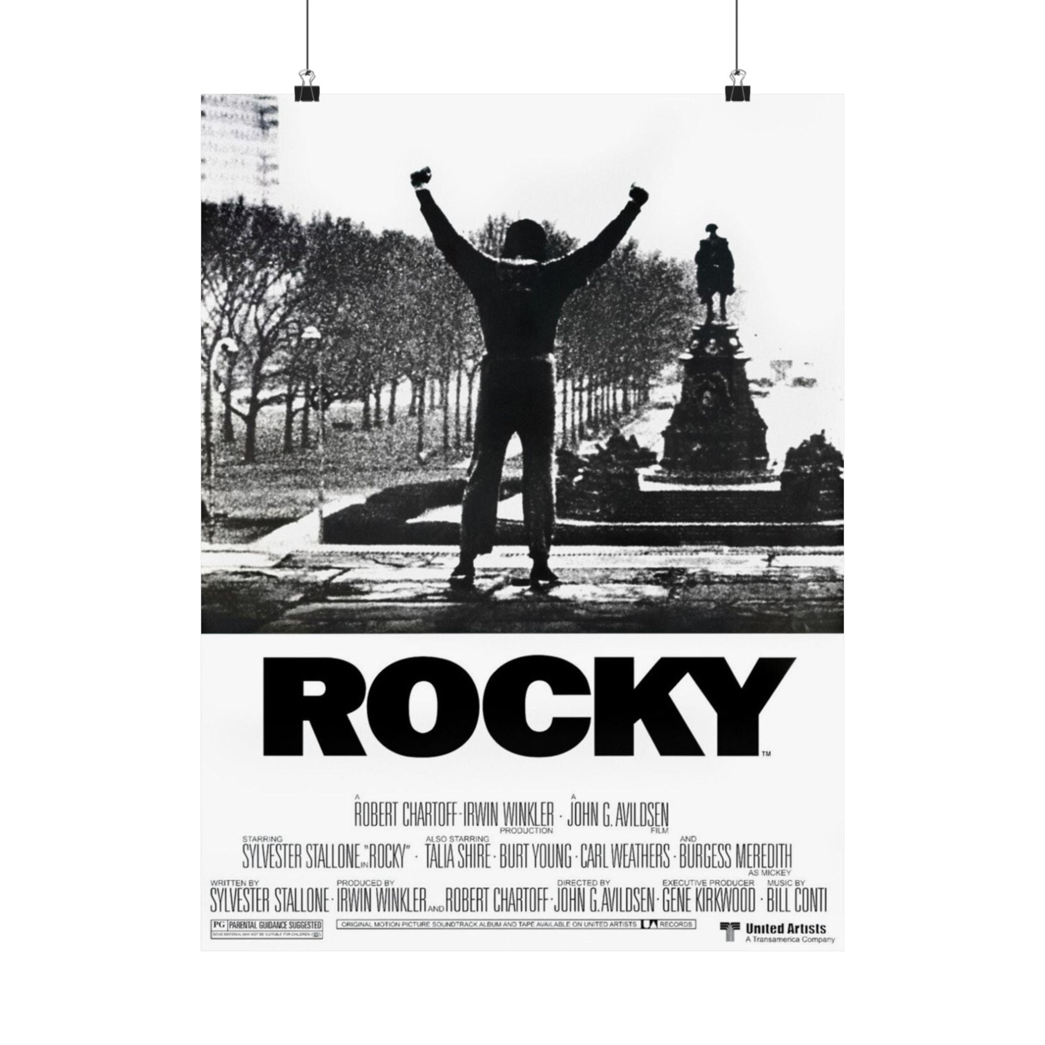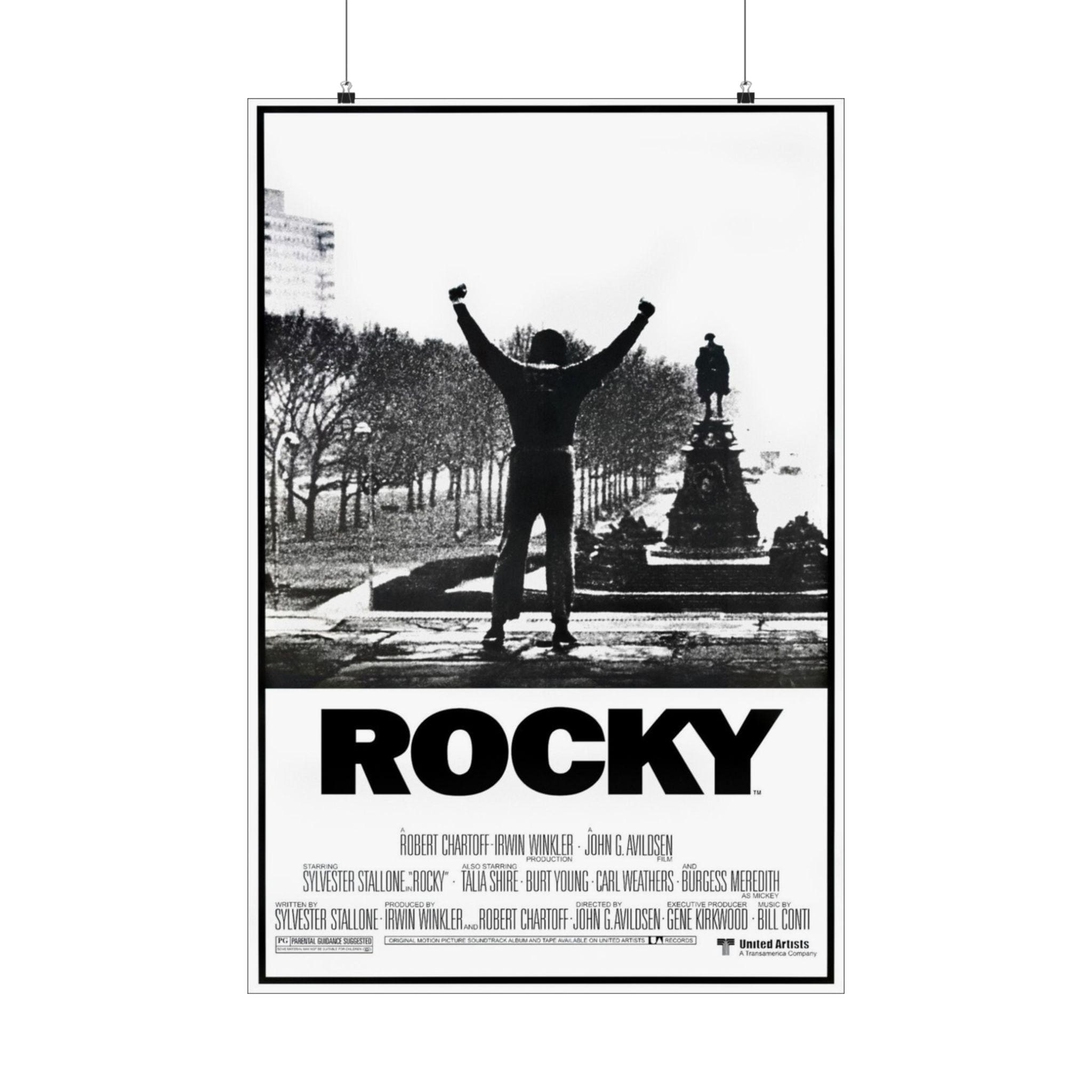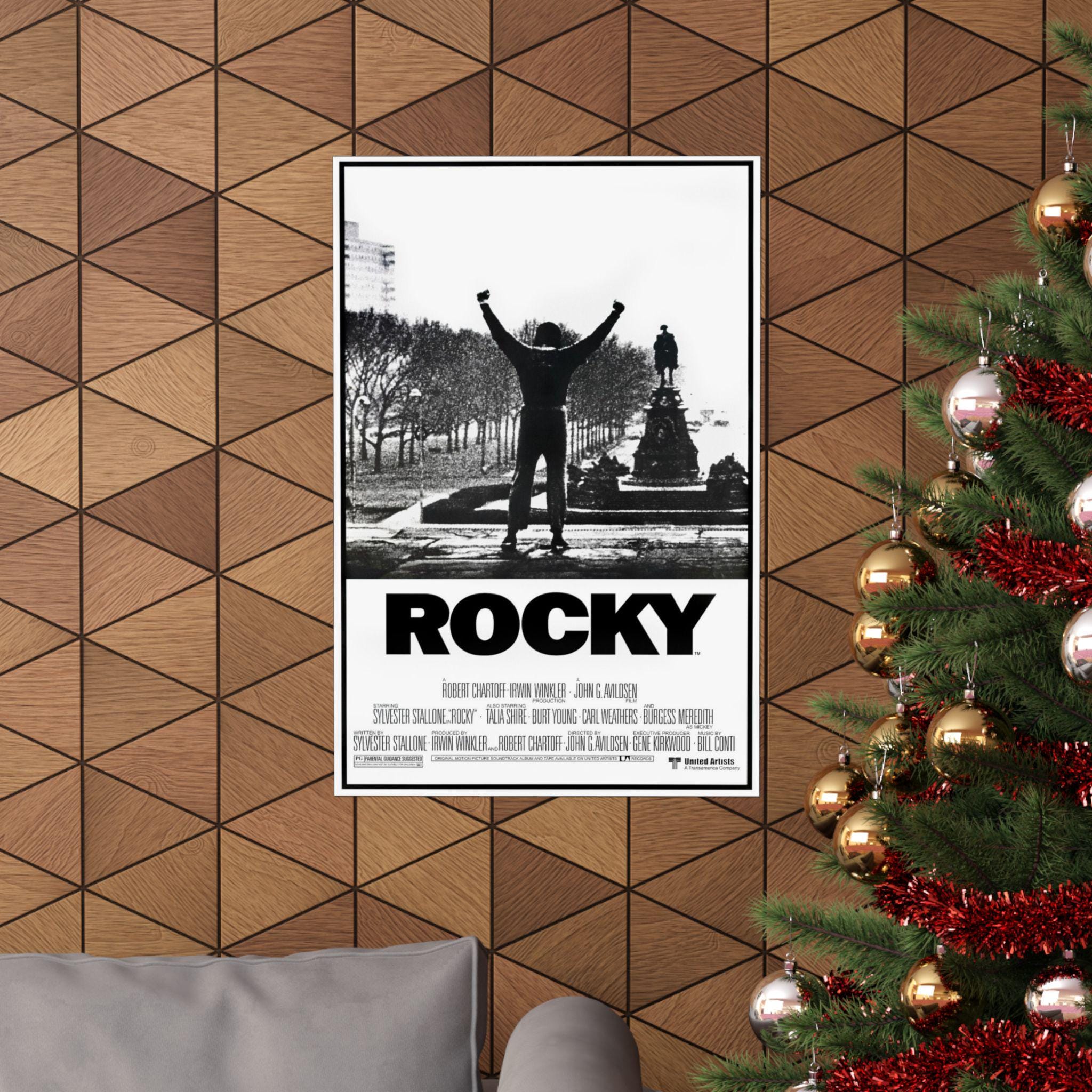 This Rocky movie poster featuring Sylvester Stallone as the star Rocky Balboa brings a classic movie vibe to any room. Perfect for movie enthusiasts and fans of the Rocky franchise, this matte vertical poster is ideal for decorating a home theater or entertainment space. Great for commemorating movie nights, birthdays, or simply adding a touch of retro charm to any decor.