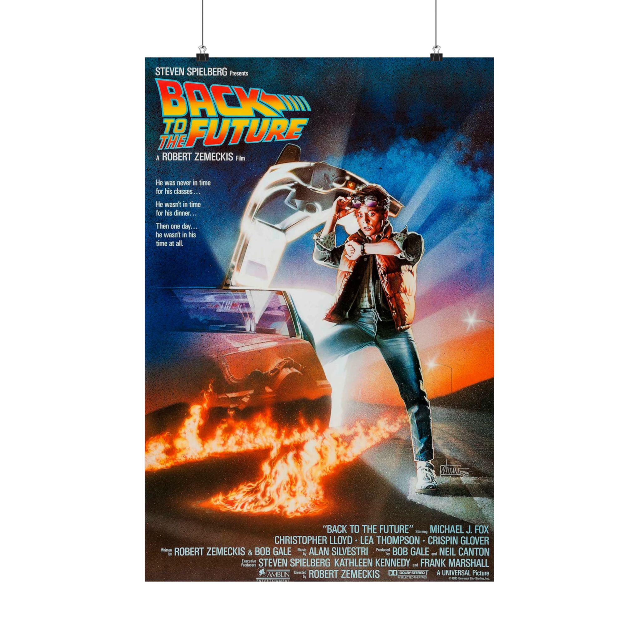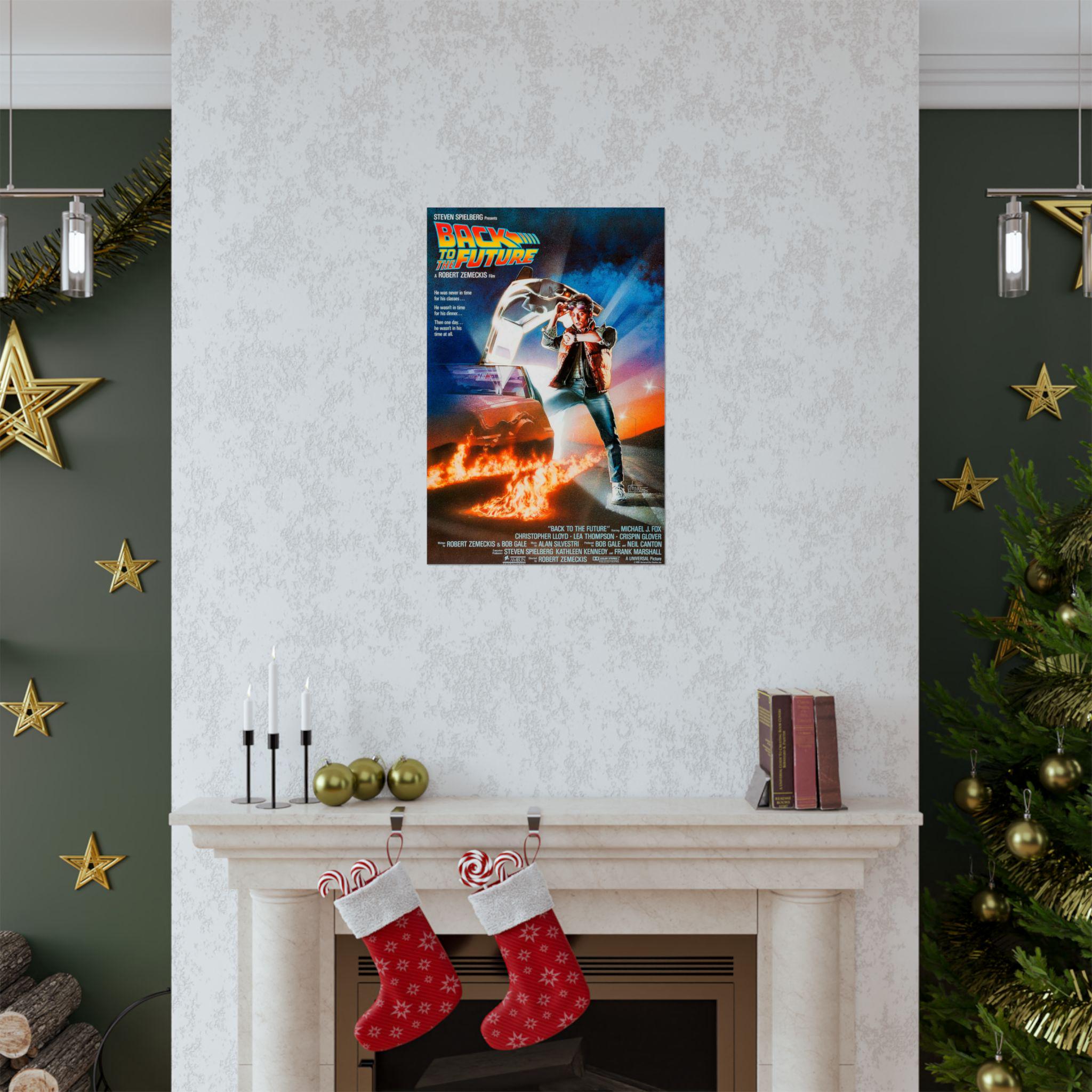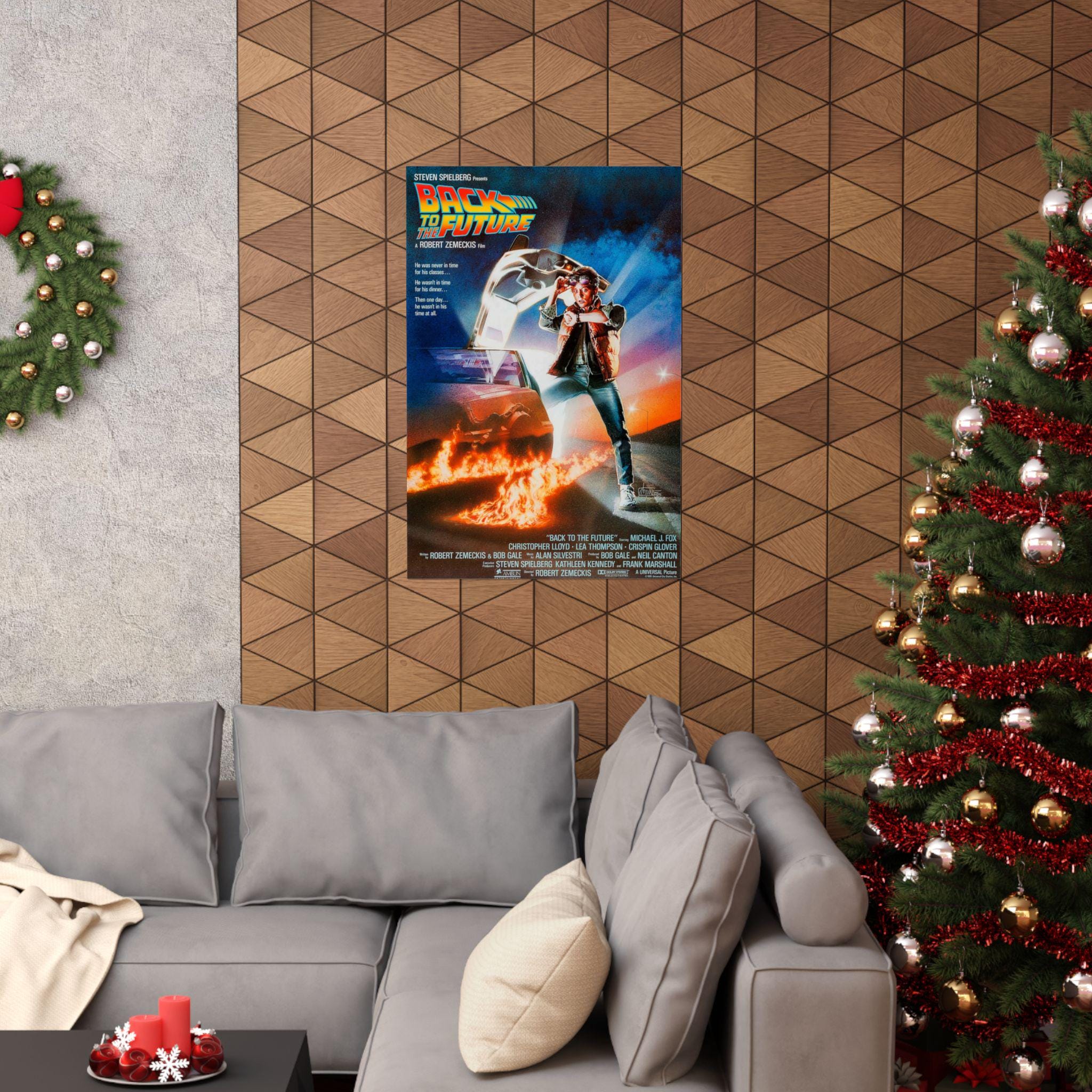 A high-quality movie poster featuring the iconic Back To The Future movie with Michael J Fox as Marty McFly and Christopher Lloyd as Doc Brown. Perfect for fans of the classic film looking to add a touch of nostalgia to their space. Ideal for movie enthusiasts, collectors, and anyone celebrating movie nights or 80s-themed parties.