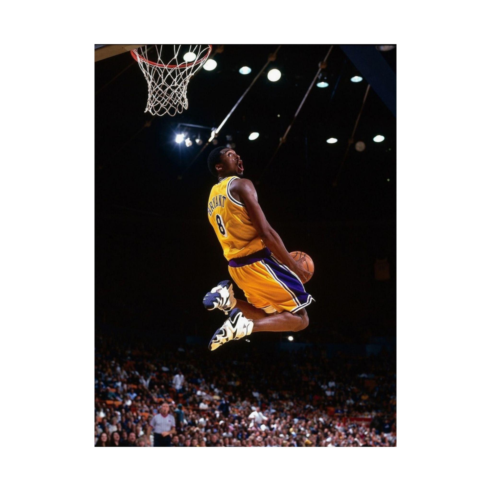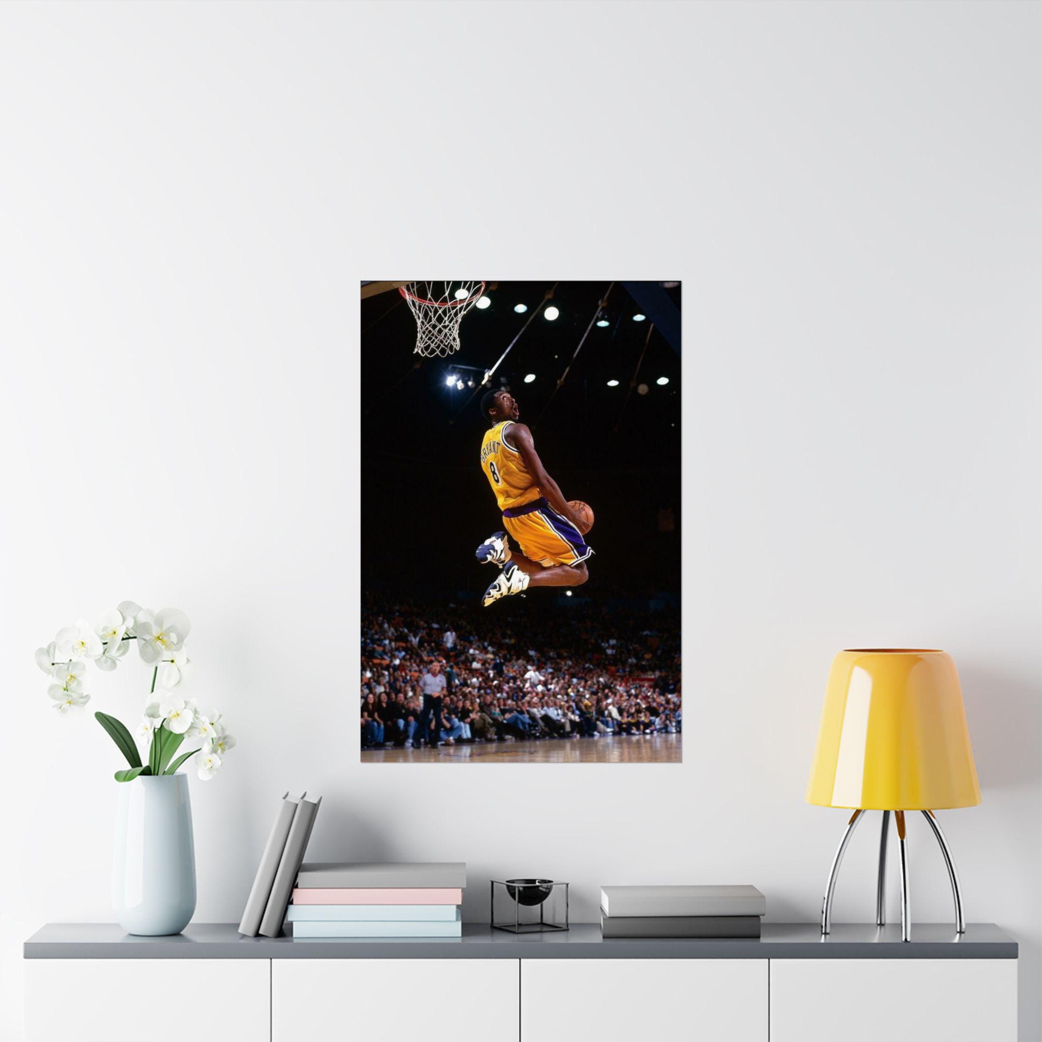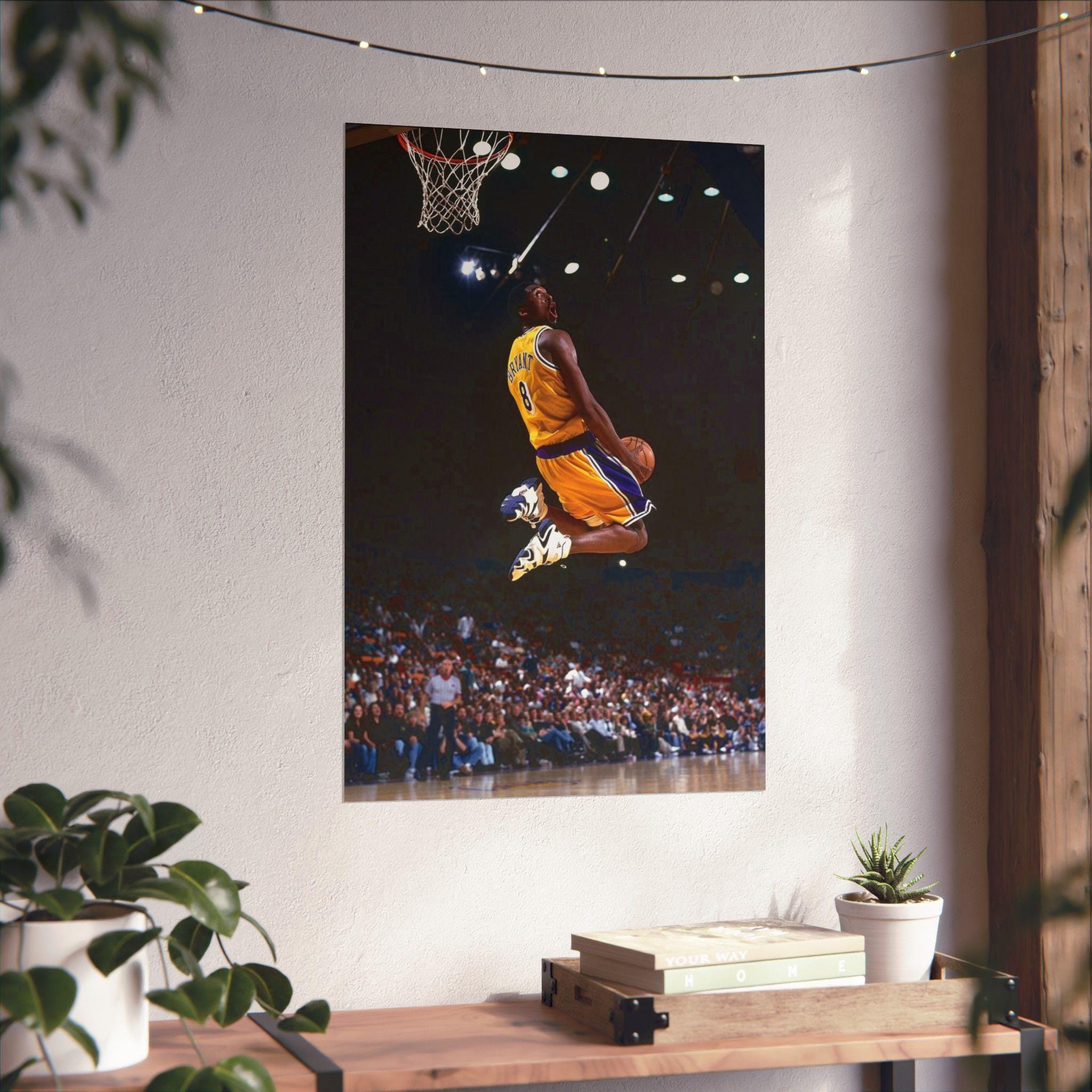 Kobe Bryant Lakers Poster featuring Kobe's iconic dunk, celebrating his 5 championships and NBA legend status. Perfect for all basketball fans looking to add a touch of sports history to their space. Relevant for basketball enthusiasts, Kobe Bryant fans, and sports memorabilia collectors. Ideal for celebrations like NBA playoffs, birthdays, and sports-themed events.