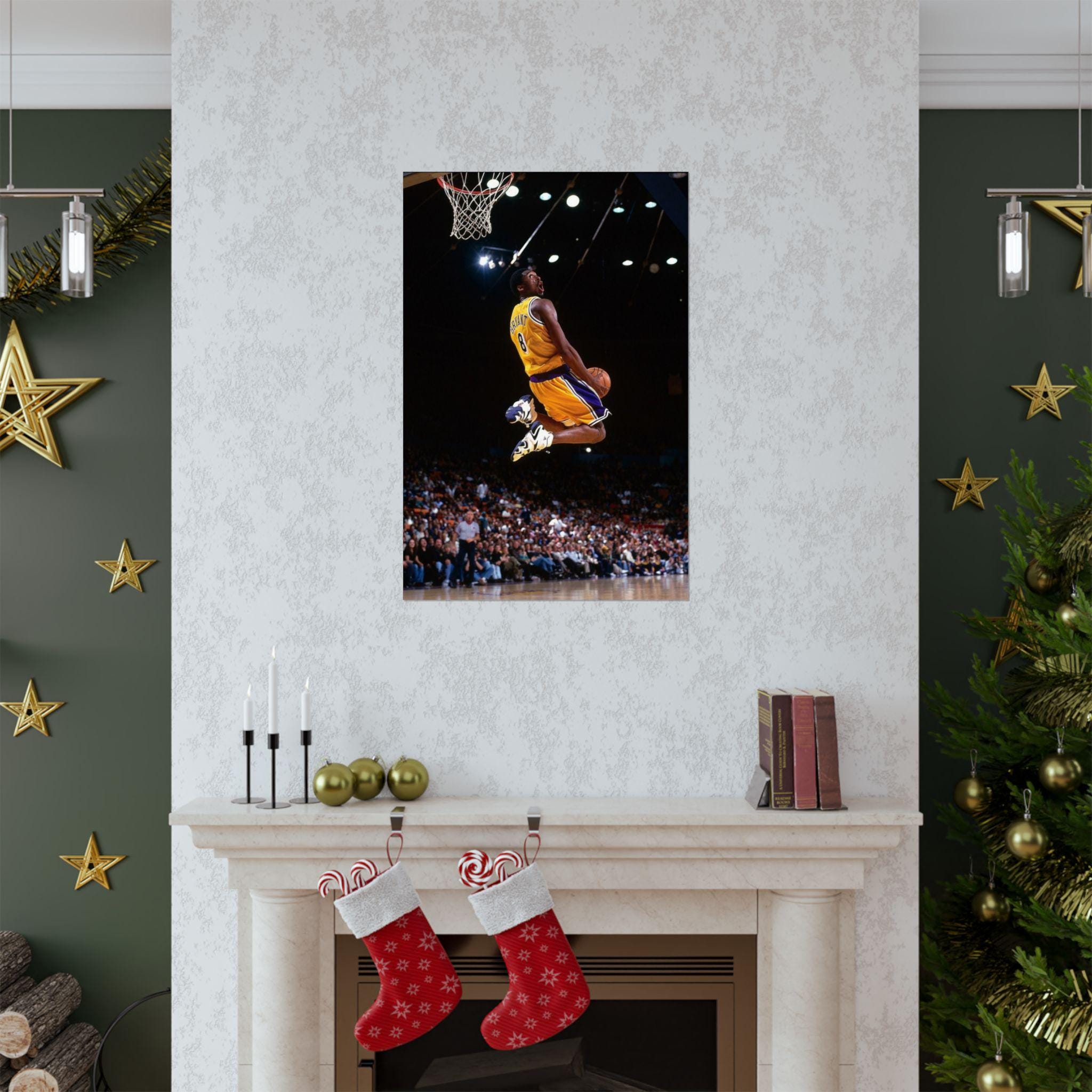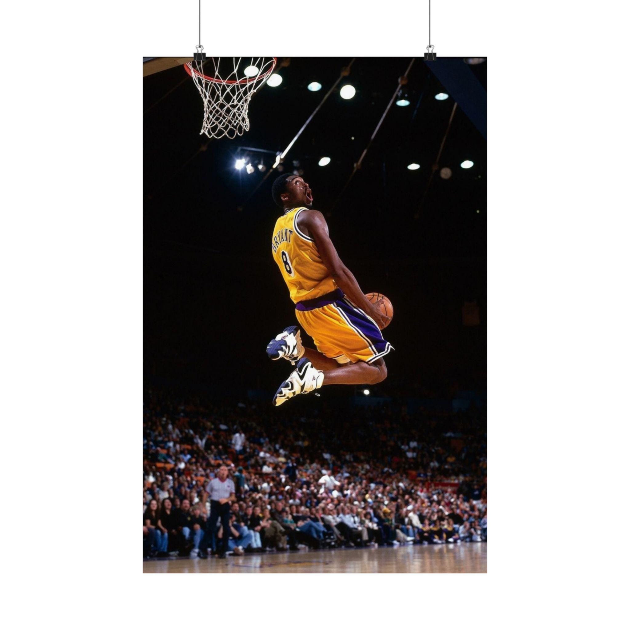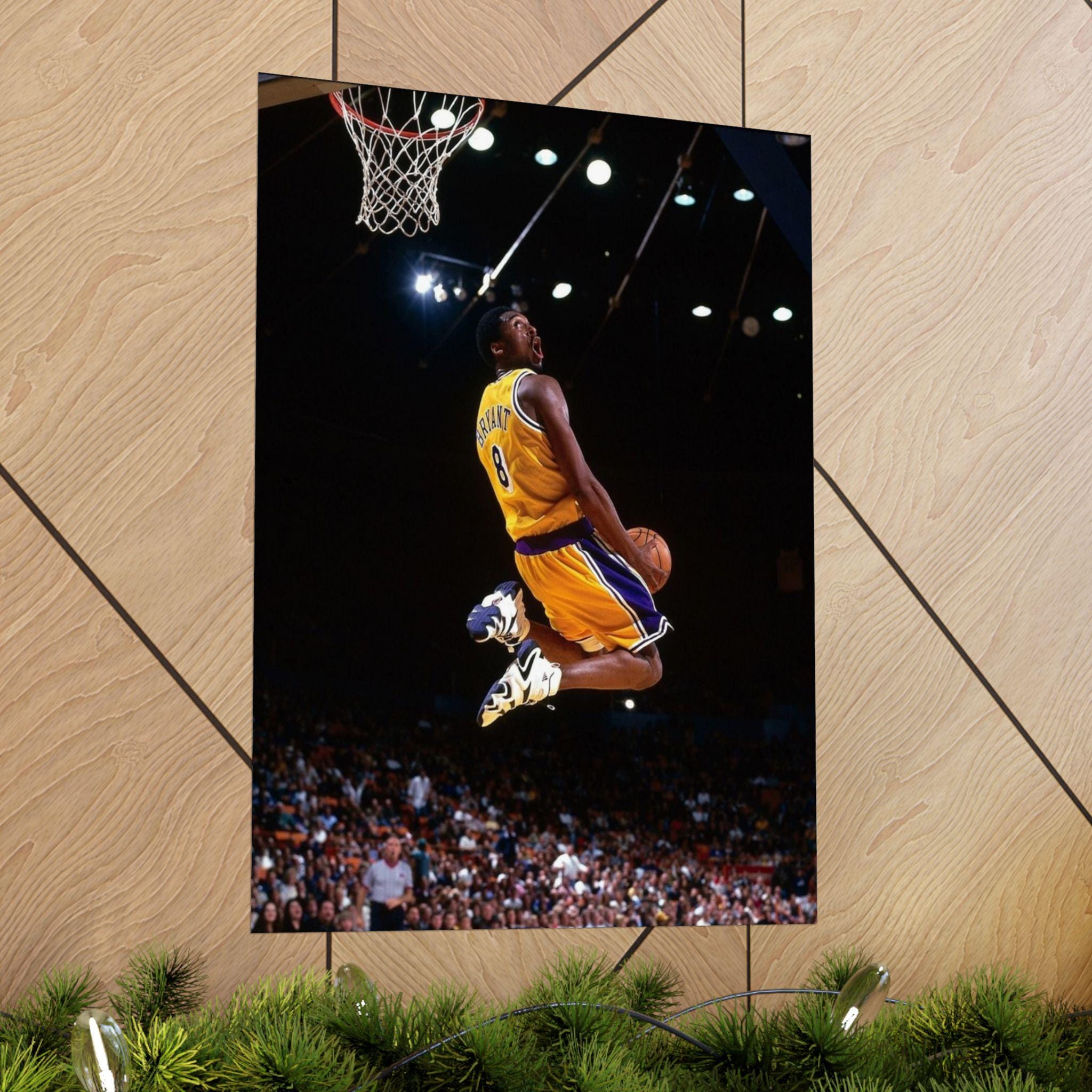 Kobe Bryant Lakers Poster featuring Kobe's iconic dunk, celebrating his 5 championships and NBA legend status. Perfect for all basketball fans looking to add a touch of sports history to their space. Relevant for basketball enthusiasts, Kobe Bryant fans, and sports memorabilia collectors. Ideal for celebrations like NBA playoffs, birthdays, and sports-themed events.